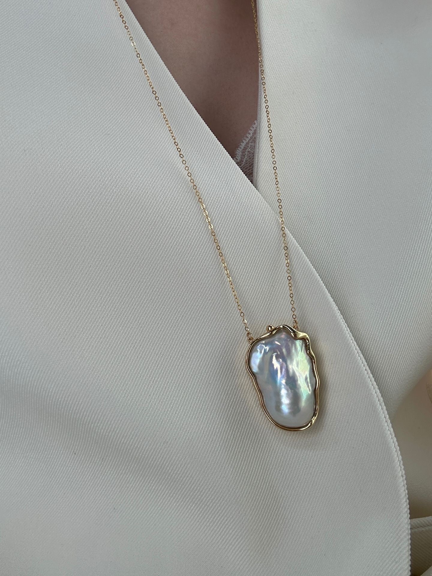 This necklace features a high-quality baroque pearl set on an 18K gold-plated S925 sterling silver base. The design highlights the pearl's natural contours and brilliance, interpreting true refinement as a bold organic form and free self-expression.