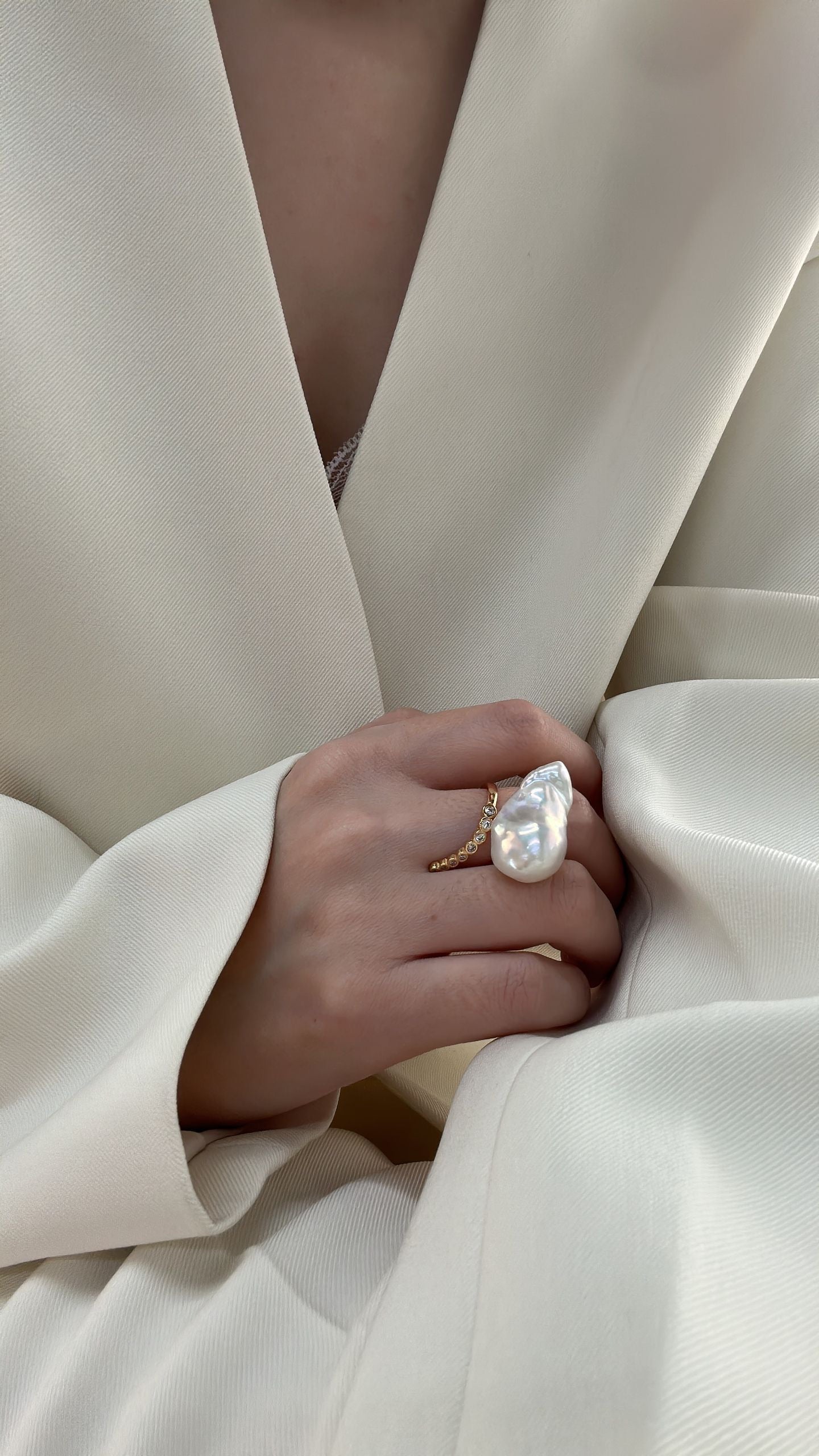 This adjustable open ring features a high-luster AAAA-grade natural baroque pearl, surrounded by a cluster of dazzling cubic zirconia. The band is crafted from 18K gold-plated S925 sterling silver.
